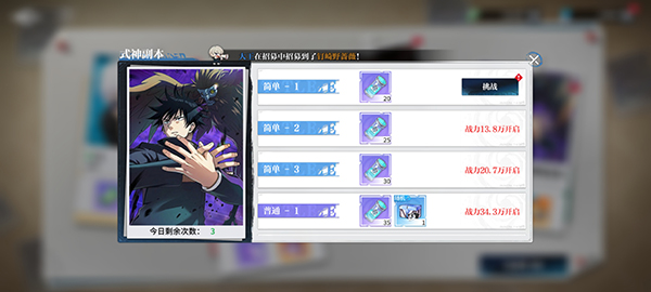 3、隨著你的戰(zhàn)力不斷提升,在式神副本中挑戰(zhàn)更高級的難度副本,可以獲得更高品質的式神碎片,每天挑戰(zhàn)的次數(shù)記得一定要完成,產(chǎn)出的材料性價比很高,就算花費鉆石完成也是必須的。