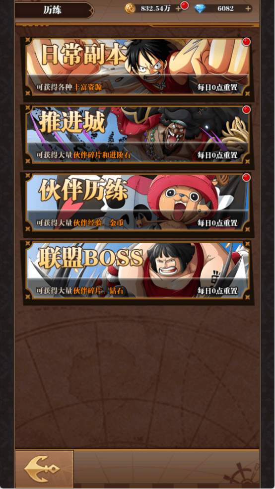 本游戲有非常多有意思的副本玩法,在推進(jìn)城中首通層數(shù)可獲得大量伙伴碎片和進(jìn)階石,掃蕩可獲得大量貝里和突破卡?;锇闅v練中可以可獲得大量伙伴經(jīng)驗(yàn)、金幣。強(qiáng)者降臨:挑戰(zhàn)boss可以獲得鉆石、進(jìn)階石和貝利。更有多種玩法,獲取豐富資源。還有更多副本玩法等你來發(fā)現(xiàn)!