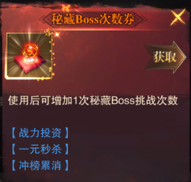 秘藏BOSS次數(shù)券來增加挑戰(zhàn)的次數(shù)。秘藏BOSS券獲得的途徑比較多,主要有: