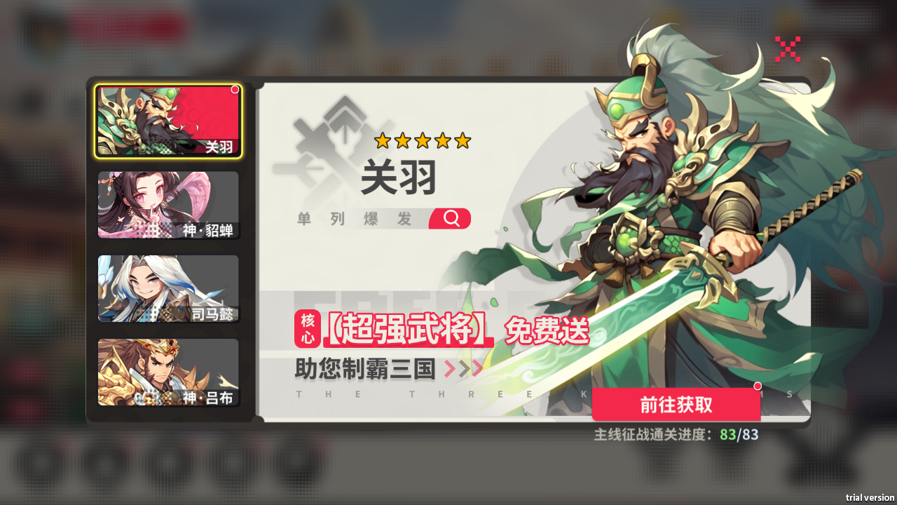 完成指定任務(wù)可得強(qiáng)力五星武將關(guān)羽、司馬懿、神·貂蟬以及神·呂布,助主公,制霸三國。
