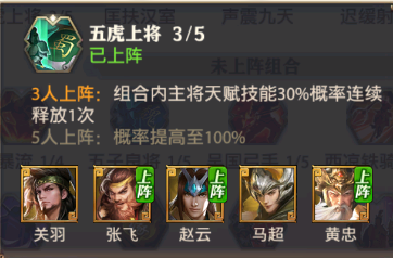 黃忠搭配張飛,劉備,趙云就可以湊齊五虎上將組合,三五虎上將會有30%的概率將天賦技能連續(xù)釋放一次!